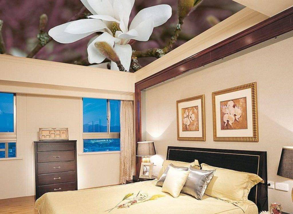Для спальни необходимо создать ощущение релакса, поэтому оттенки должны быть спокойными, чуть приглушенными, мягкими. Обилие контрастов исключается. Дизайнеры советуют следующие фотопечатные варианты: «звездное небо», различные космические варианты, эффект струящейся шелковой ткани, неяркие цветочные или геометрические мотивы. Вместо ночника предлагается рассмотреть вариант с использованием встроенных светильников, которые позволяют регулировать интенсивность освещения. Эффектно и умиротворяюще будут смотреться дополнительные мерцающие светодиоды.