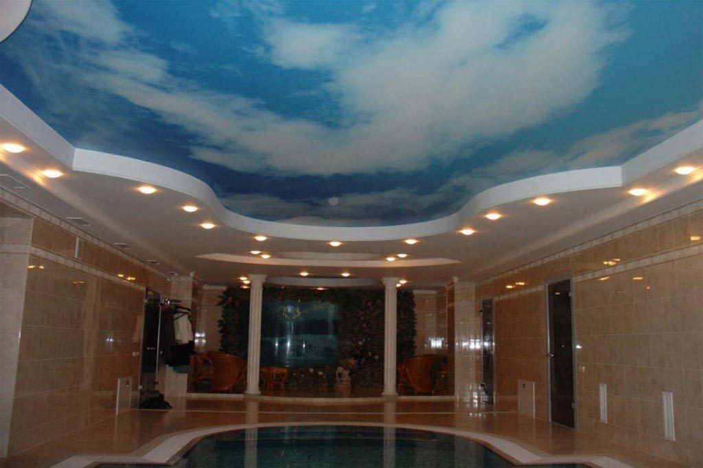 Освобождаемый таким нехитрым способом центр используется для натягивания пвх-полотна. Очень часто натяжной потолок в этом варианте становится частью общего концептуального замысла, когда выполняется его последующая отделка под звездное небо, солнечный день, облака или любой другой принт, выбранный оформителями.
