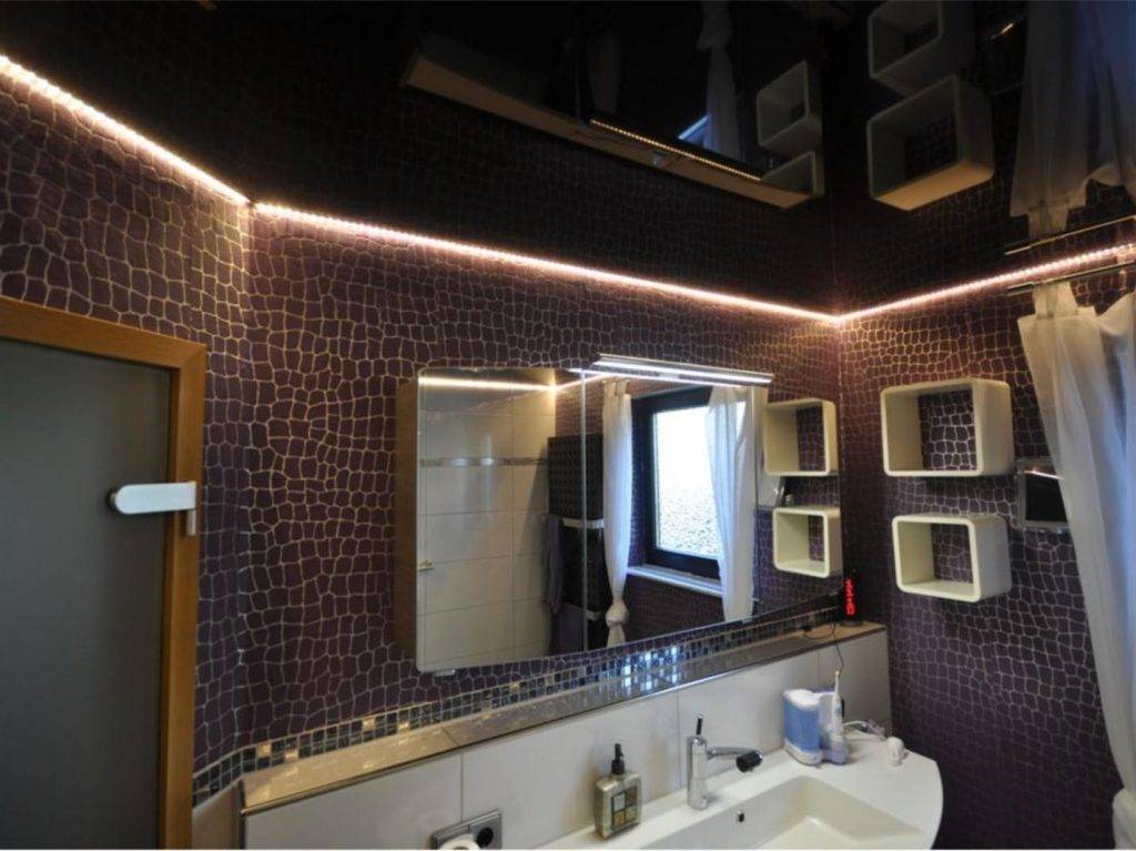 В ванной комнате, естественно, уместна тема воды, например, морская. Возможно сочетание двух-трех оттенков без рисунков. Уровни не должны иметь чрезмерно большой разбег между собой. Поскольку люстра в санузле смотрится громоздко, дизайнеры предлагают вместо основного источника использовать плоские осветительные приборы либо установить встроенную подсветку.