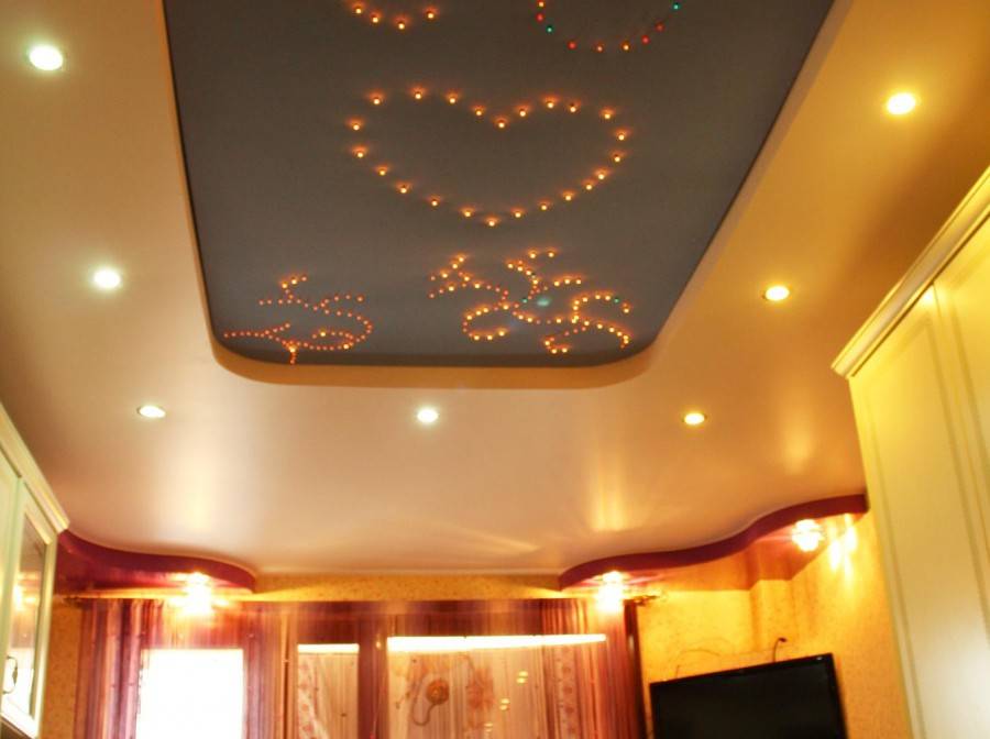 Хотите оригинальный дизайн? Для одного из уровней возьмите полупрозрачное натяжное полотно и установите светодиодные ленты в виде фигурных узоров по своему вкусу.