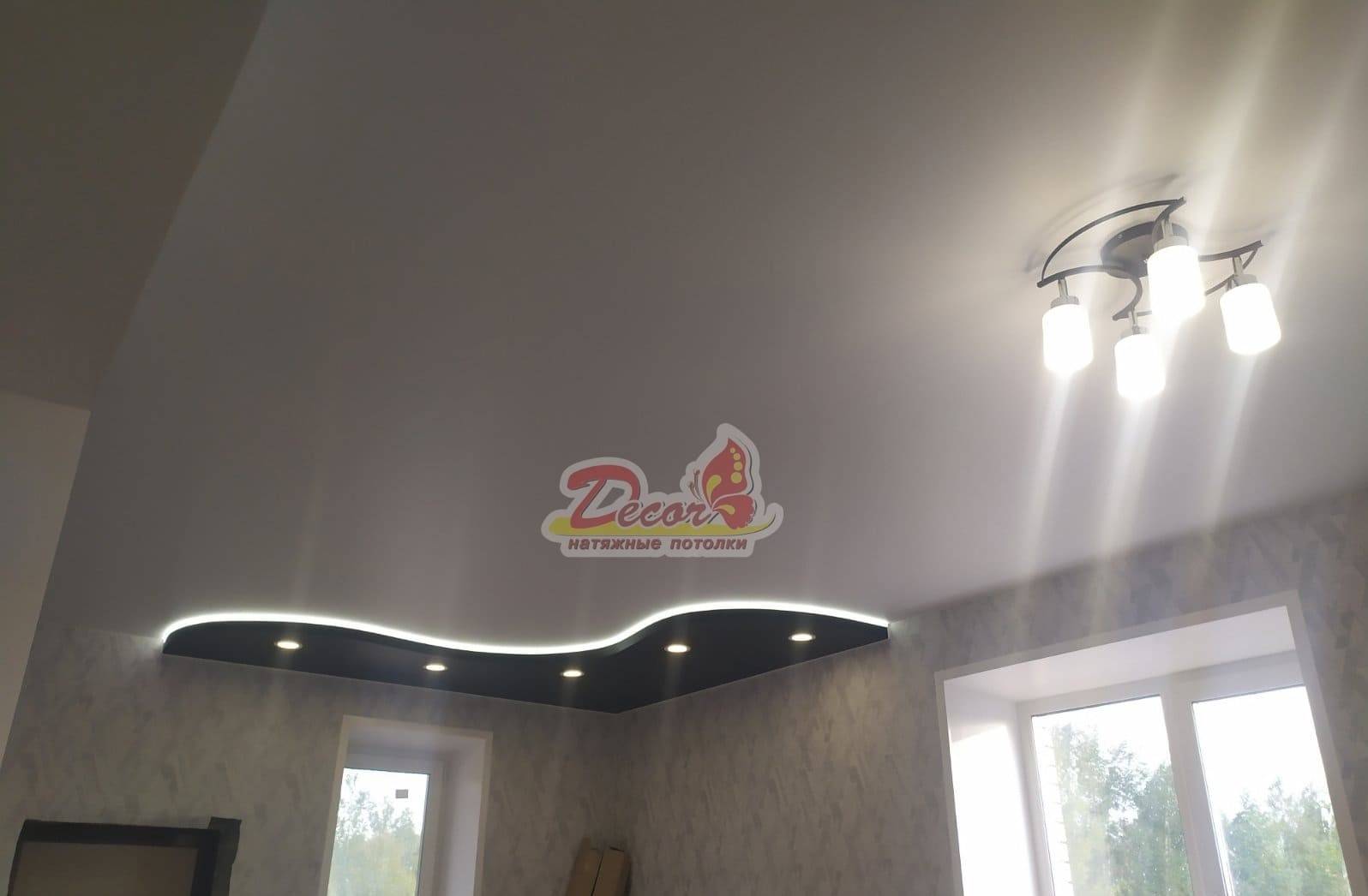 Двухуровневый натяжной потолок – это по-настоящему оригинальная и уникальная декоративная конструкция, которая способна скрыть дефекты основной потолочной поверхности, спрятать от посторонних глаз некрасивые трубы и прочие коммуникации, а также сделать интерьер помещения изящным и индивидуальным. Вполне допускается оснащение натяжного потолка светильниками, а также точечной или светодиодной подсветкой.