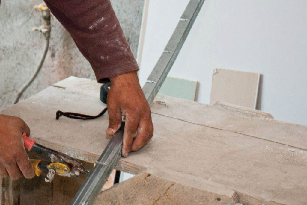 Чтобы закрепить гипсокартонные листы на сооруженный каркас, необходимо использовать разбежку. Первый ряд начинается с листа полного размера, который монтируется на профили.