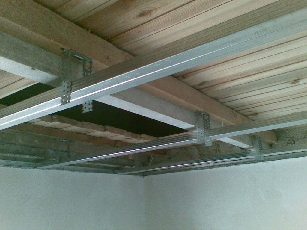 - далее к подвесам и UD-профилю фиксируют потолочные профили CD на саморезы. Для стыковки профилей тоже используют саморезы. Чтобы исключить провисание потолочного профиля, каждую CD-планку подтягивают средними подвесами, «уши» которых подгибают под профили;