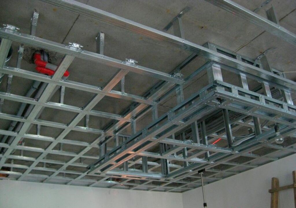 - Каркас второго потолка усиливается поперечинами, затем готовый каркас обшивается листами ГКЛ.