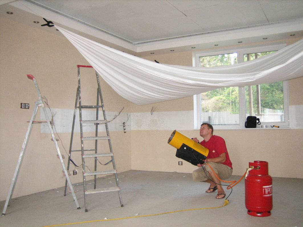 - полотно прогревается тепловой пушкой, поскольку в месте провисания оно сильно растягивается;