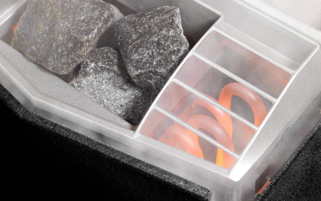 Особенности конструкции электропечи заключаются в металлическом корпусе с чашей, в которой располагаются элементы для нагрева. В специально оборудованное место помещаются камни, где происходит воздействие на них тепловой энергией. Раскаленные элементы предназначены для отдачи тепла помещению, за счет этого происходит поддержание микроклимата парной. От большого количества камней положительного эффекта не получится. Требуется укладывать столько, сколько подразумевает производитель.