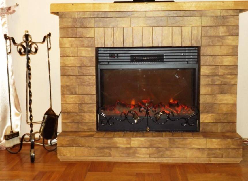 Портал делается неглубоким – 15-25 см., часто для его устройства используют нишу в стене. Здесь имеется каминная полочка, позволяющая красиво разместить семейные фото, свечи в канделябрах, мелкие сувениры. Внутри обычно лежат дрова или их муляжи.