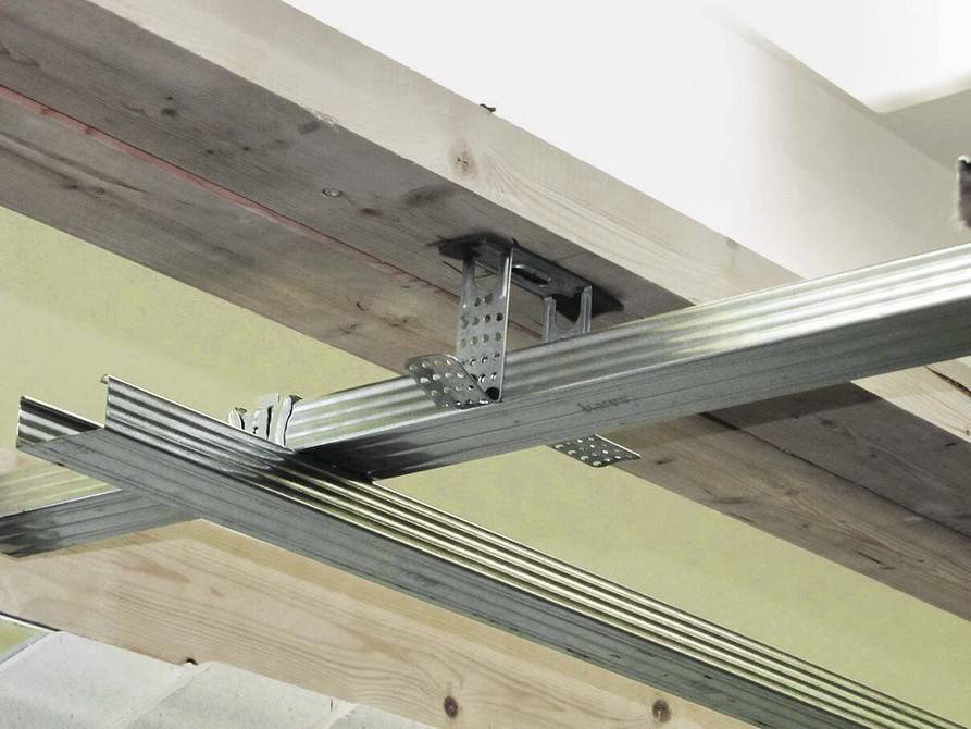- Жесткая каркасная система. Она прекрасно работает как на сжатие, так и на растяжение. По многим техническим показателям эта конструкция не уступает базовому потолку, так что это надежный вариант. В данном случае каркас можно покрыть гипсокартоном, панелями или фанерой.