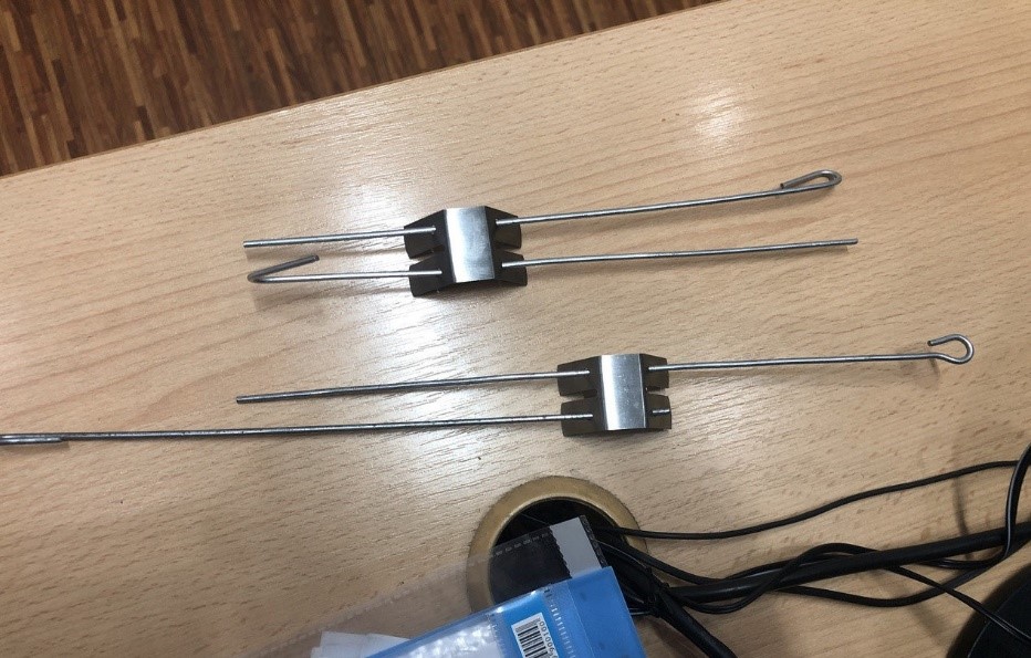 Регулируемые подвесы – представляют собой стальные спицы разного диаметра – от 3 до 6 мм. Габарит сечения зависит от массы конструкции и предела прочности несущего элемента. Данные подвесы могут применяться сразу в нескольких типах подвесных конструкций и, помимо прочности, различаются по гибкости. Как правило, один конец такого элемента имеет зазубрины для расклинивания в теле перекрытия, а второй торец снабжён захватом, который удобен для крепления перпендикулярных элементов подсистемы.