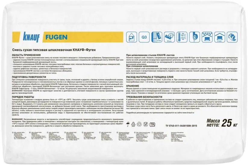 Гипсовая смесь с полимерными добавками изначально была разработана немецкими технологами с целью заполнения заводских швов между гипсокартонными листами. Трещиностойкая шпаклевка Фугенфюллер от Кнауф имеет следующие технические характеристики: