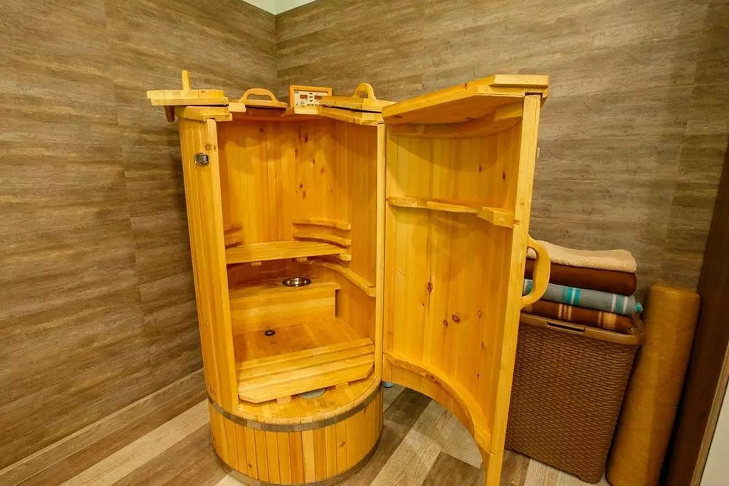 Изготавливают кабину из натуральной древесины сибирских кедров. Кабина сконструирована так, чтобы во время сеанса тело пребывало внутри, а голова – снаружи. Благодаря этому, организму легче переносить парные процедуры из-за снижения температурной нагрузки на сердце и сосуды головного мозга. Порог в кабине низкий, вход широкий, чтобы без проблем могли зайти тучные люди для оздоровления и похудения.