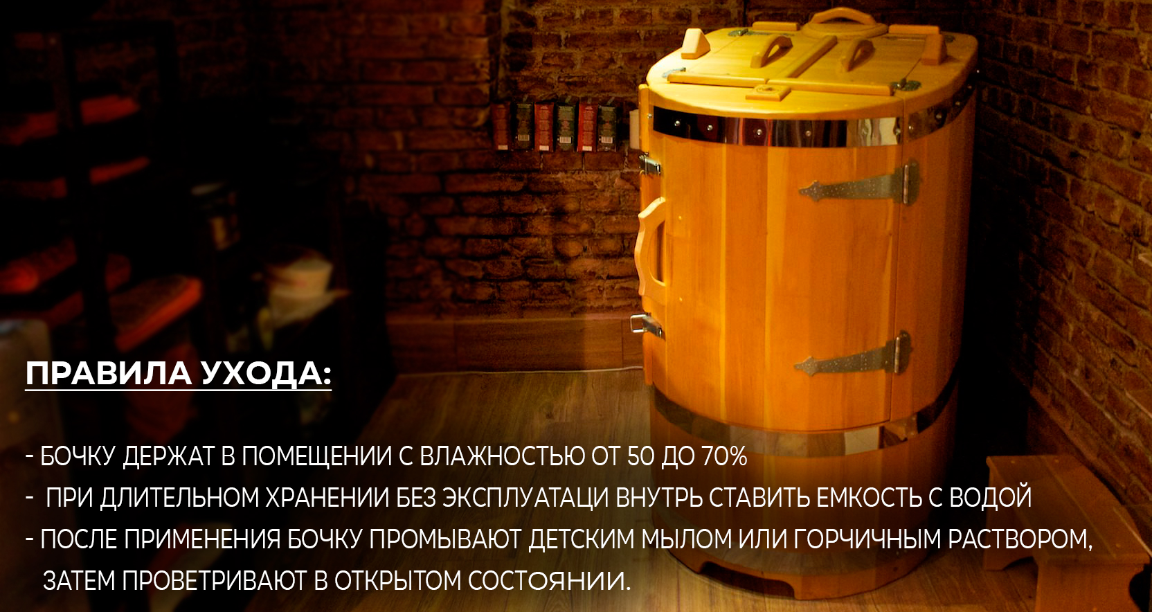 Не рекомендуется находиться в бочке-сауне дольше 30 минут и использовать моющие средства. После выхода из бочки, тело не вытирается полотенцем. Его нужно просто промокнуть. Рекомендуется после процедуры одевать тёплую одежду и выпить 1-2 стакана фито чая.