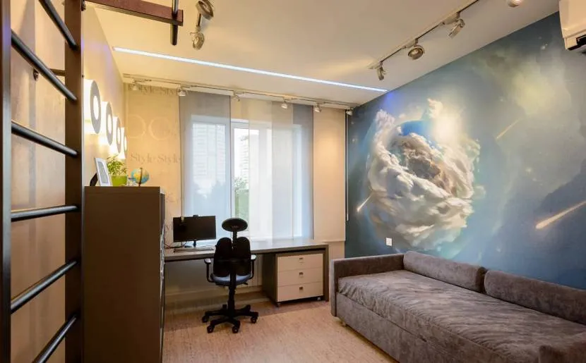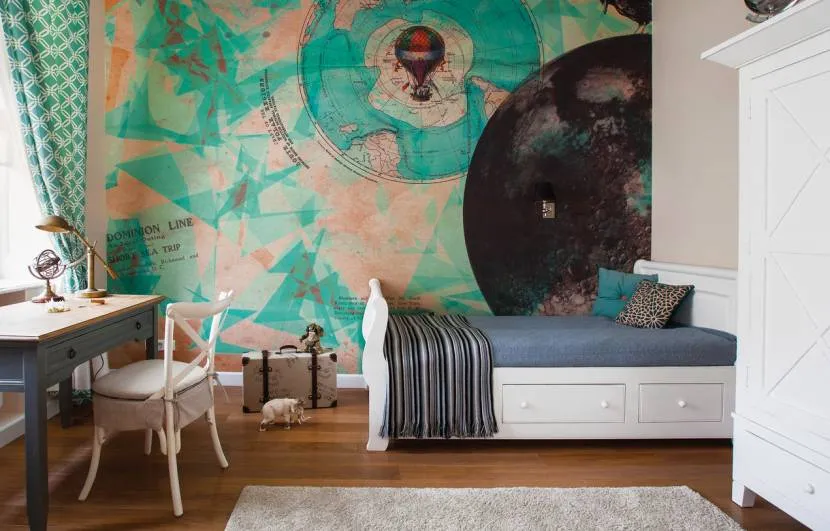 Если правильно «поиграть» с фотообоями, комната не будет унылой. Геометрическая абстракция – это классические обои в детской комнате для мальчика, фото любимых спортсменов или певцов также стали неотъемлемым атрибутом подростковой спальни. Что касается цветовой гаммы, темно-синий остается универсальным вариантом. Он не отвлекает, не раздражает, и его можно красиво сочетать с другими оттенками.