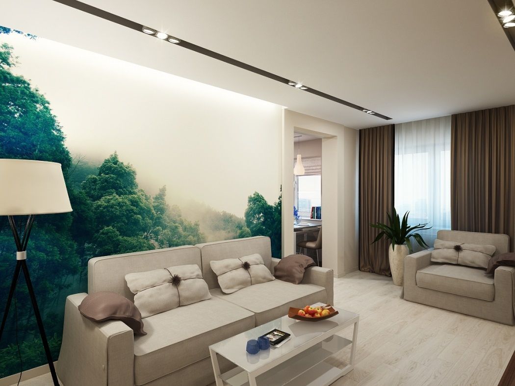 Один из способов визуального расширения пространства – печатный рисунок на всю стену. Широкий выбор фотообоев с 3D-эффектом дает возможность нестандартного решения при организации пространства. Сочетание фото обоев в интерьере гостиной с другой отделкой предполагает хорошее воображение, чтобы представить конечный результат, как на фото.