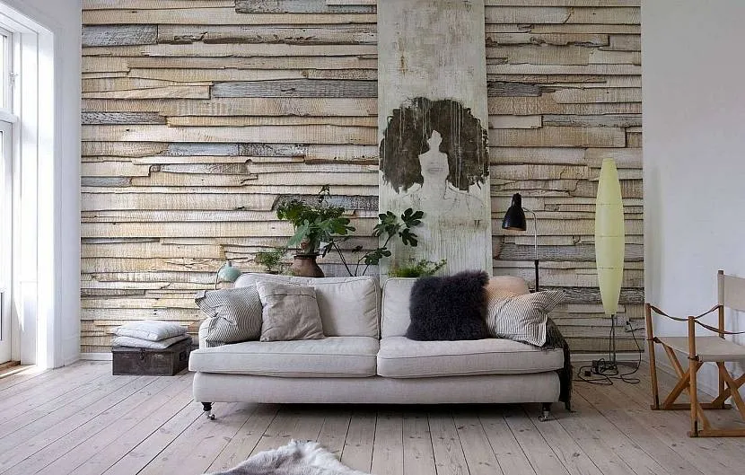 Оригинальные интерьеры с каменной или древесной облицовкой выглядят красиво и надежно. Не обязательно делать в доме кладку из кирпича или оформлять стены панелями из дерева. Можно приклеить объемные настенные обои с изображением природной текстуры.