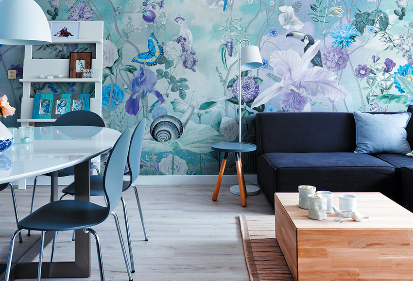Флористические орнаменты выглядят более нежно, если однотонные цветки располагаются на светлом фоне. Яркие букеты придают гостиной жизнерадостность и игривость. При комбинировании полотен с крупными и маленькими цветами получается пышный нарядный интерьер. Обычно подобные рисунки создаются при помощи розовых, бордовых, красных тонов, но нередко используются оригинальные синие, золотистые или черные оттенки.