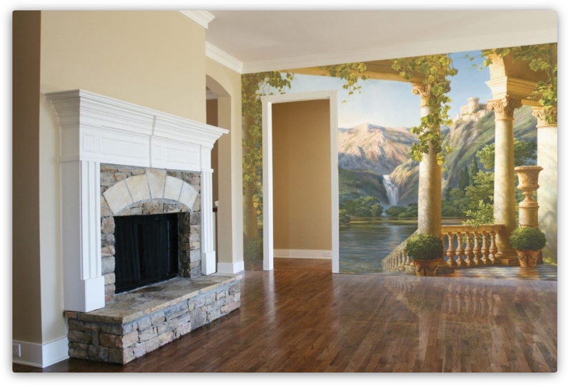 На фото фреска, которая в арочной композиции создает имитацию открытого балкона. Для такого интерьера стены должны быть нейтральной окраски.