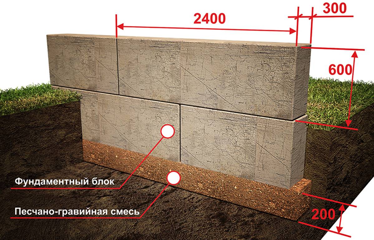 На дно траншеи выкладывается подушка из песка и щебня толщиной 15 см (для пучинистых грунтов для компенсации подвижности подушка может достигать 35 см). Подушка должна быть на 15-25 см больше фундамента, блоки не должны с нее свисать.