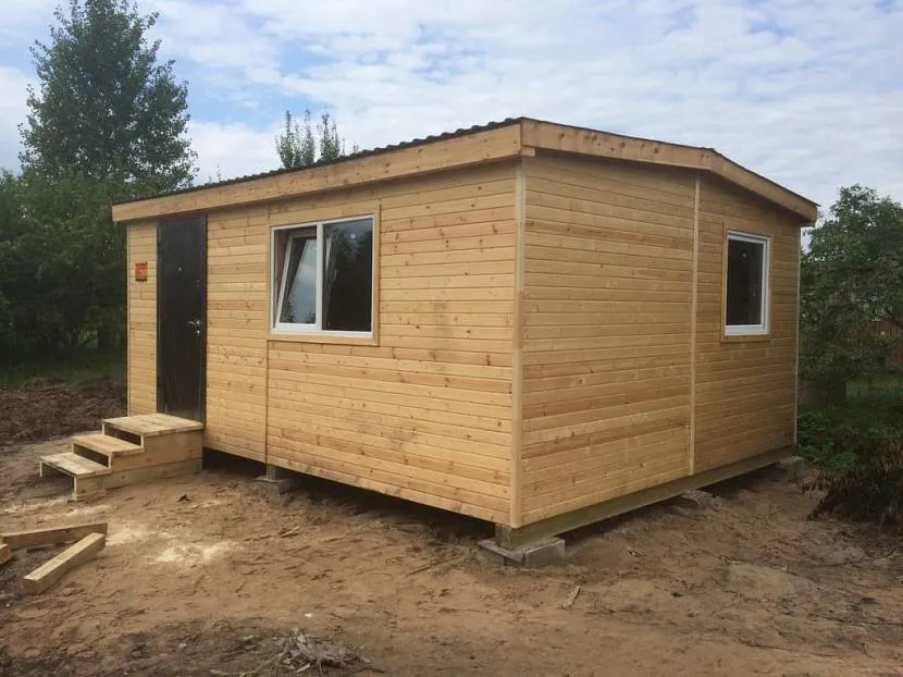 Иногда можно обойтись без прочной опоры, бытовку нужно устанавливать на деревянный каркас, его можно обшить досками или плитами и накрыть кровельным материалом. Участок, предназначенный для размещения каркаса должен быть ровным и утрамбованным. Требуется только сделать подсыпку и установить нижнюю подвязку каркаса на блоки. Это позволит защитить конструкцию от разрушения во время выпадения осадков.