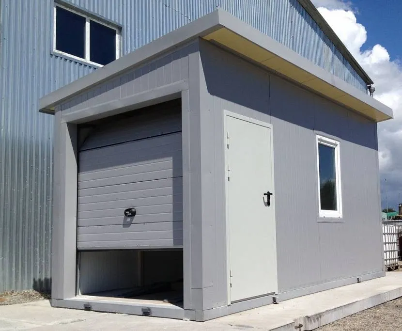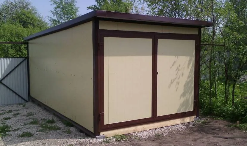 Каркасные конструкции устанавливаются на небольшой бетонированной площадке. В качестве стенового материала чаще всего используются сэндвич-панели или металлические листы. Для этих целей также подойдет прочное тентовое покрытие, но это скорее временный вариант.