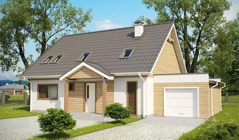 Гараж, совмещённый с домом, что позволяет сэкономить материал на постройке одной стены. Преимуществом является тот факт, что предусмотрен ход из дома в гараж. Дополнительной двери на улицу и окон нет. Размеры позволяют разместить не только автомобиль, но и маленькую мастерскую или хозблок.