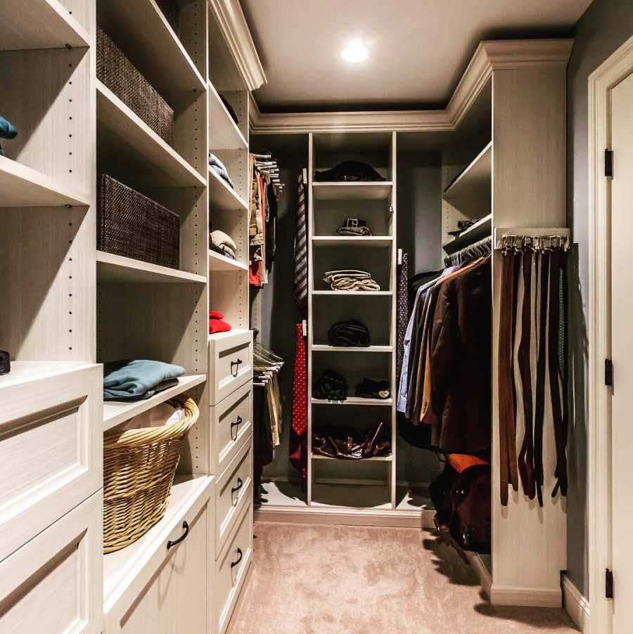 Одна из идей для маленькой уютной гардеробной — глубокий шкаф, по-английски называется reach in closet system. Располагается обычно в нише, отличается большой вместительностью и удобством использования.