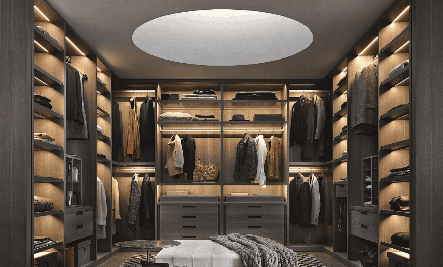 Гардеробные комнаты маленьких размеров должны нести удобство. В первую очередь подумайте о равномерном и качественном освещении.