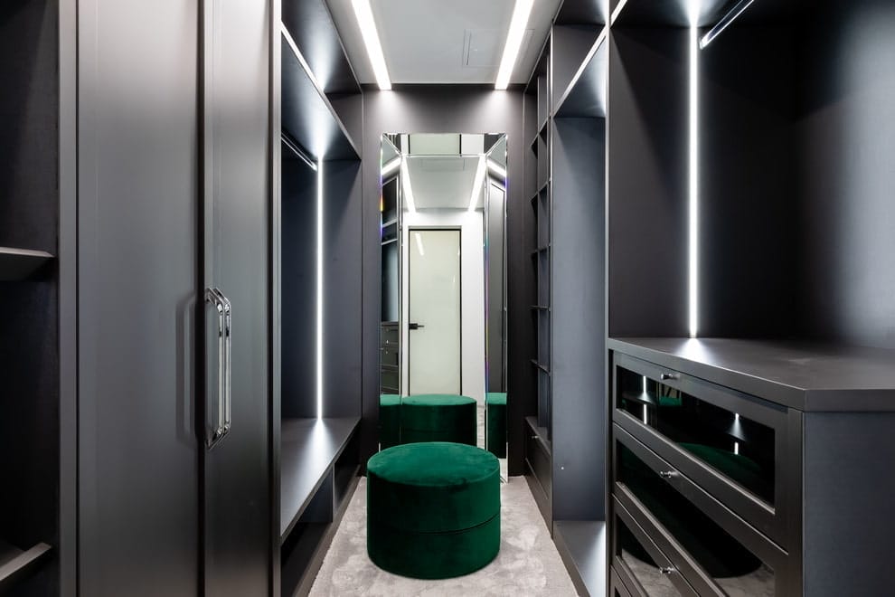 Стоит учитывать, что часть комнаты, в которой обустраивается гардеробная, остаётся бесполезной из-за прохода к ней. Возможен и креативный вариант расположения конструкции в спальне – проходной, когда через неё нужно пройти, чтобы попасть в комнату.