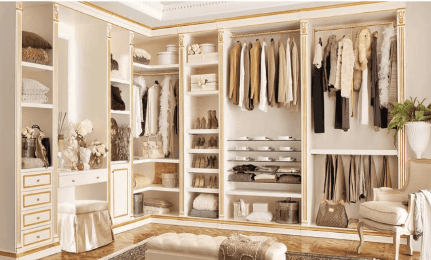 Чаще всего женская гардеробная оформлена в классическом стиле или имеет элементы рококо и барокко. Допускается использование лепнины и других украшений.