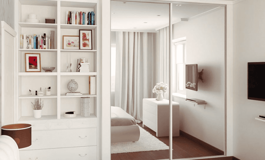 В некоторых случаях на территории вещевого хранилища располагают гладильную доску и зеркала. Хорошо продуманная конструкция гардеробной займет в спальной комнате немного места. Особенно уместным будет данный вариант хранения вещей, если спальня оформлена в скандинавском стиле или в комнате присутствует минимум мебели.
