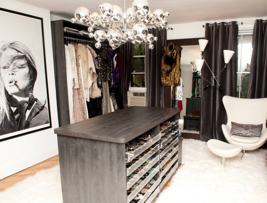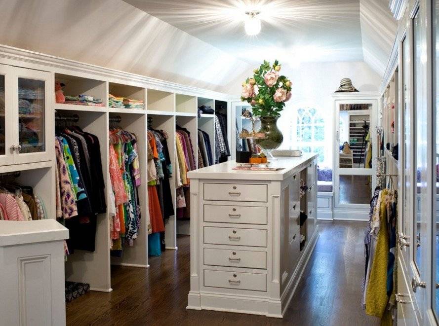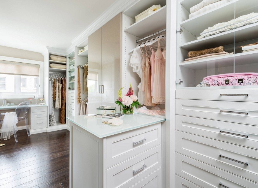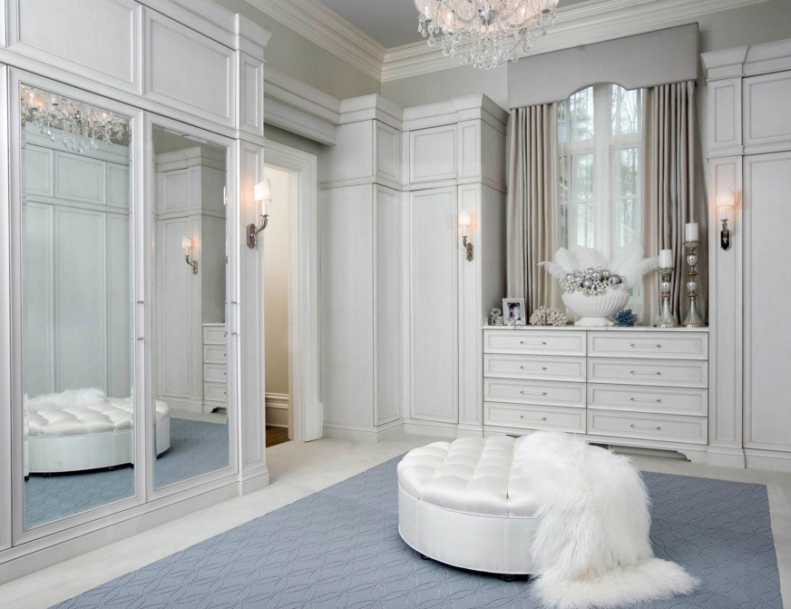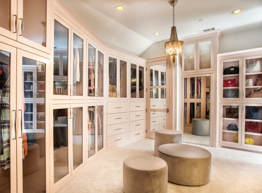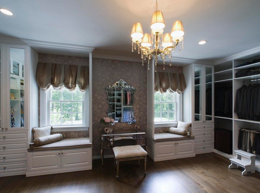 Женская гардеробная часто оформляется в светлых тонах. Если позволяет место, внутри устанавливают туалетный столик и пуф. Часто на пол настилают ковер, а стены украшают картинами.