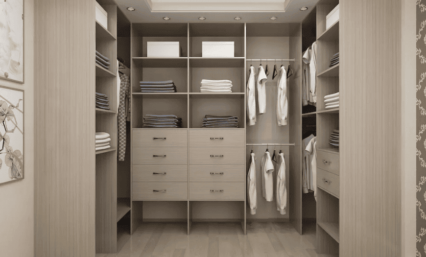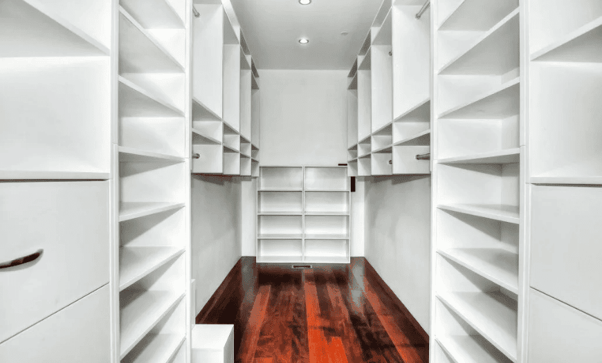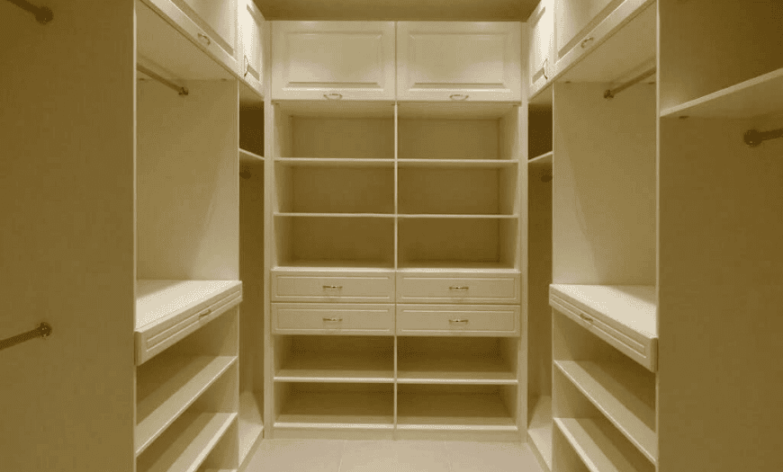 Под системы хранения задействуются три стены, на которых устанавливаются стеллажи или полки. Узкие помещения лучше не использовать. Подойдут те, чья форма приближена к квадрату. П-образный вариант считается одним из самых практичных, поскольку дает возможность разместить большое количество вещей. При этом пользоваться таким гардеробом удобно.