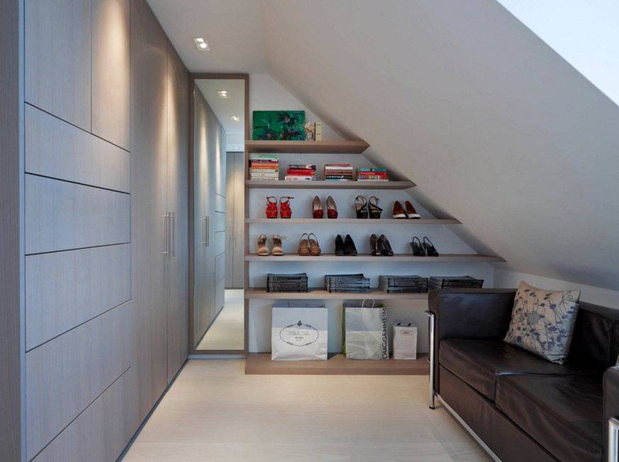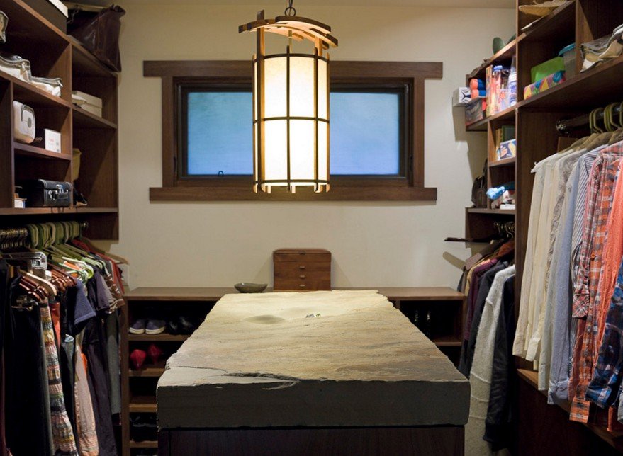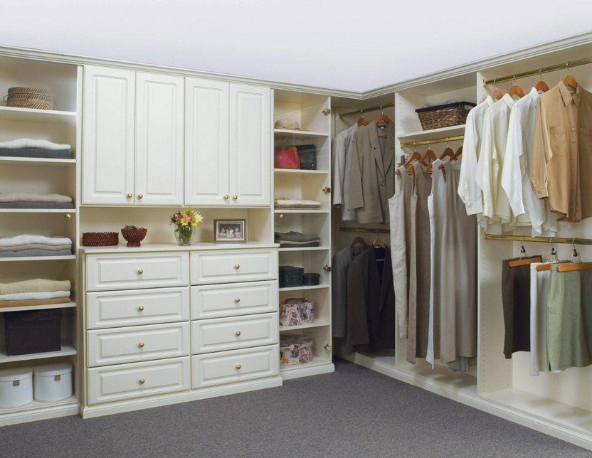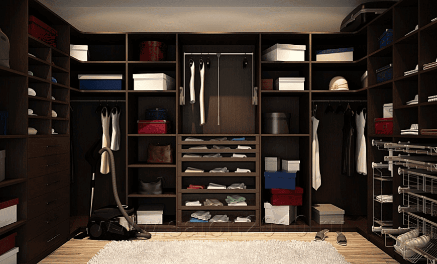 Закрыть вход можно дверью, ширмой, или оставить открытым. Вдоль стен расположить стеллажи для хранения. Угловой вариант расположения способен вместить больше вещей, чем линейный