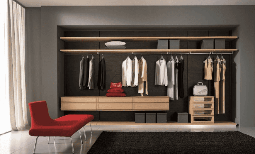 - в одну линию — этот способ предполагает расположение всех предметов гардероба в одну линию. По внешнему виду вся комната напоминает внутреннее содержимое обычного шкафа купе. Считается идеальным решением для маленького пространства.