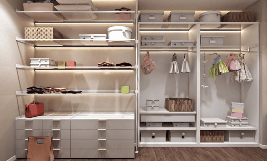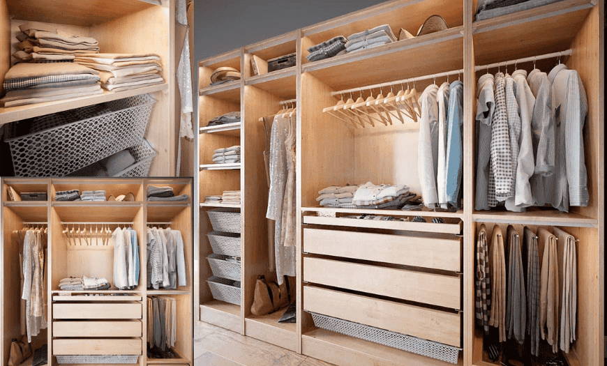 Для оснащения мест хранения одежды, обуви и других вещей используется оборудование и системы хранения, специально предназначенные для гардеробных или шкафов-купе. Экономное решение — это использование системы «Сделай сам».