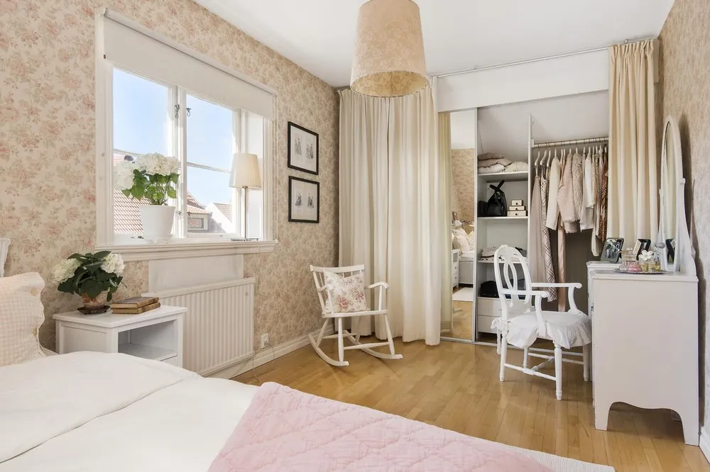 Часто вместо двери вешают шторы. У этого варианта есть преимущества и недостатки. Текстиль можно часто менять, обновляя интерьер по своему усмотрению. Шторы создадут дополнительный уют, к тому же их проще сочетать с прочими декоративными элементами в помещении. Среди минусов небольшой срок службы, необходимость регулярной стирки. Еще один недостаток — плотно закрыть двери в гардеробную не получится, что актуально, если в квартире есть дети или домашние животные.