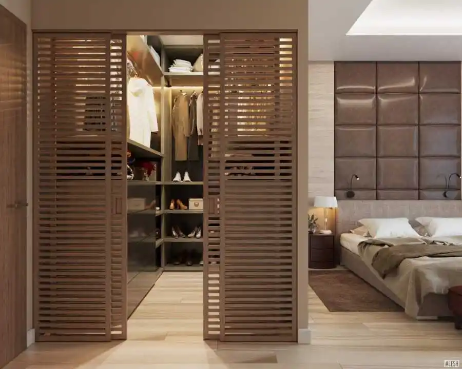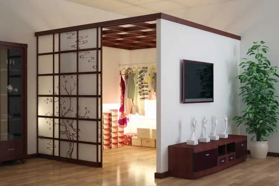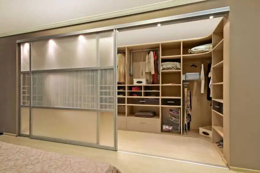 Отделить гардеробную можно с помощью раздвижных дверей-купе – как стандартных, так и радиусных (полукруглых). Для высоких помещений подойдут перегородки с дверным проемом, выполненные из фанеры или гипсокартона, а также различные ширмы или шторы.