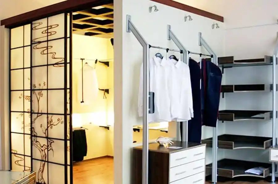 Один из самых оптимальных вариантов, когда в квартире уже имеется отдельное помещение. Владельцу и мастеру достаточно лишь выполнить внутреннюю отделку помещения, оборудовать полки, стеллажи и центральную ось для вешалок. Последним этапом подбирается дверь и монтируется подвижная конструкция.