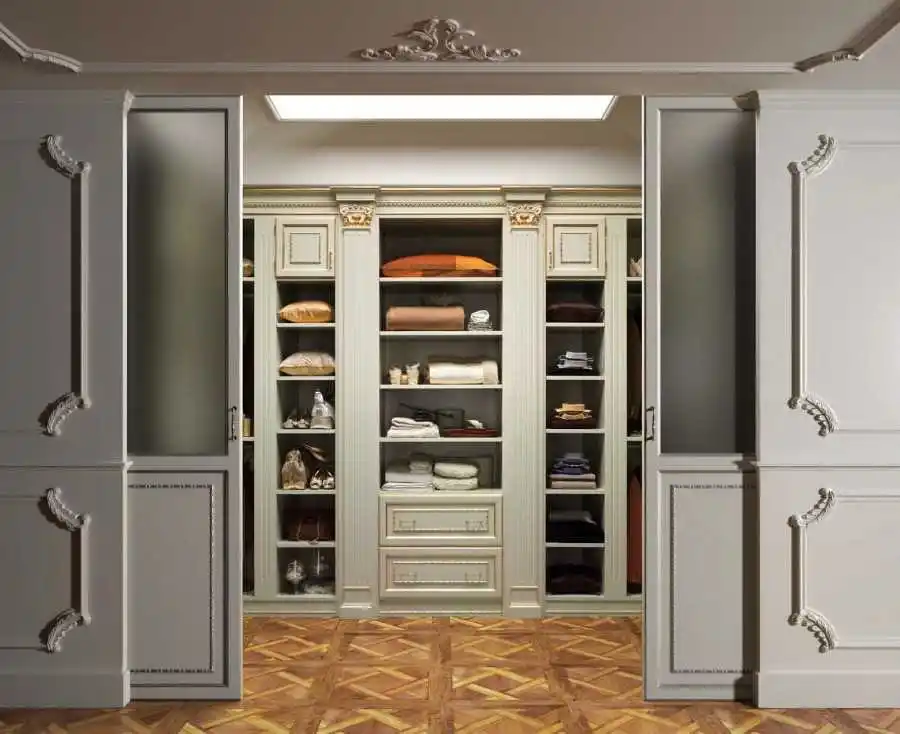Гардеробную в классическом стиле можно оформить с помощью резных деталей, плинтусов или пилястр. Для дверей применяют патинирование, золочение, а также используют специальные сетки для создания эффекта состаренности.