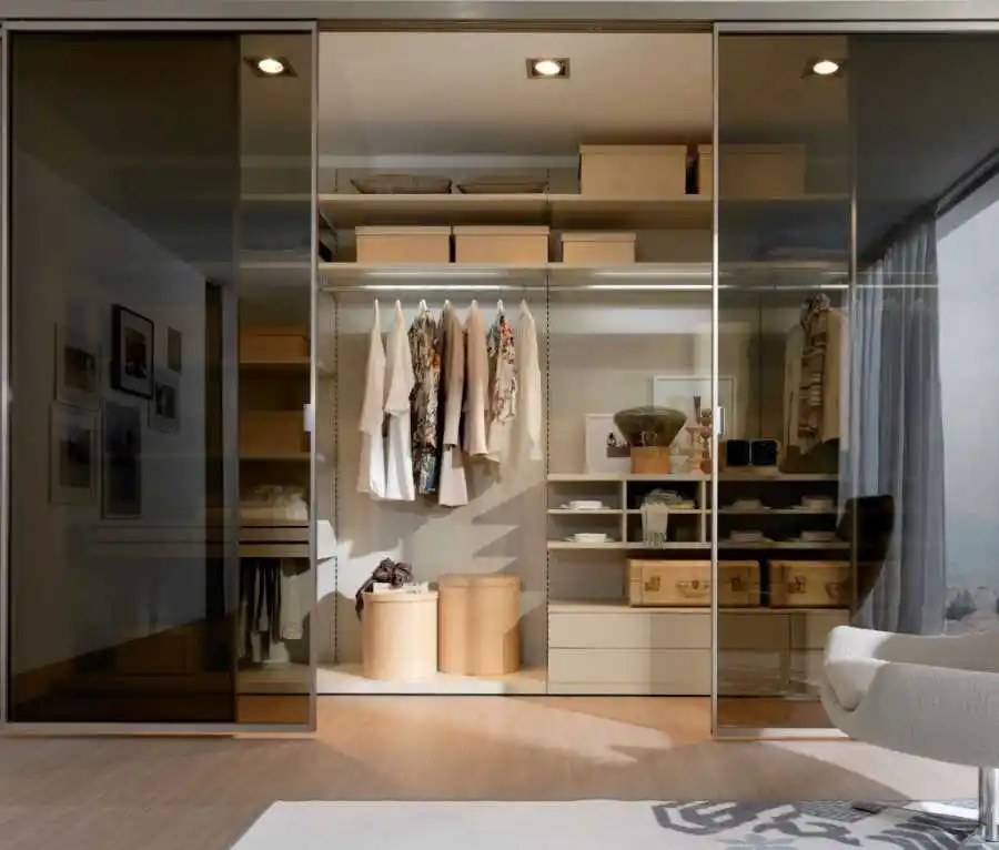 Как видно на фото, шкафы-купе для хранения вещей актуальны для современного стиля, а также для арт-деко, эклектики и хай-тека: