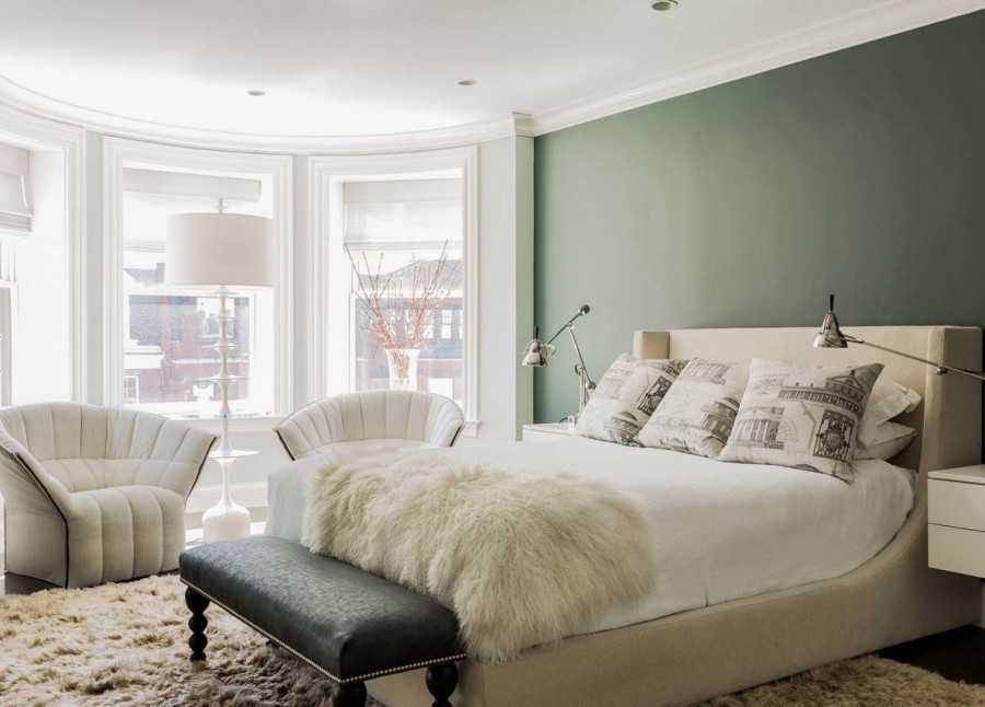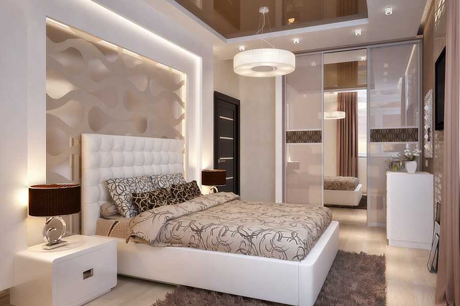 Такие цвета для потолка, как бежевый или белый позволят визуально сделать его выше. Если вы хотите увеличить пространство, то планировка спальни в таком случае должна быть тщательно продуманной и лучше выбрать натяжной глянцевый потолок, который будет отражать свет. Многие сегодня уже забыли про использование популярного некогда гипсокартона, а очень зря. В современных интерьерах он смотрится очень выигрышно.