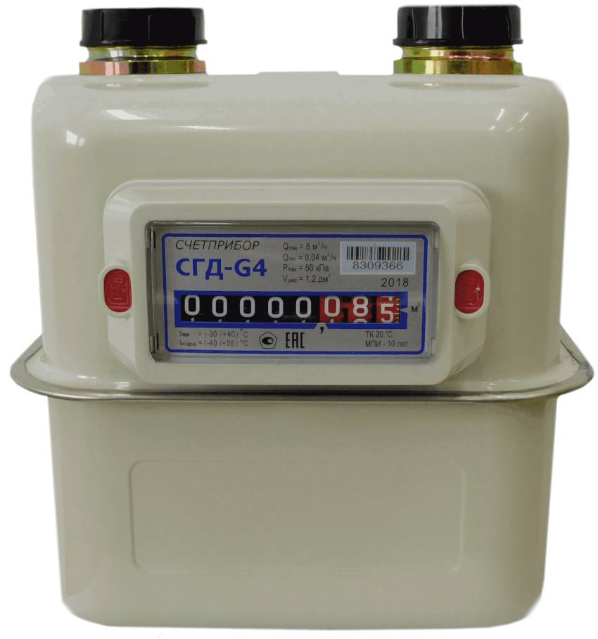 Используется для учета небольших газовых потоков. Механический энергонезависимый аппарат камерного типа, разделен на два отсека. В верхнем находятся патрубки для ввода и вывода потока. Внутри корпуса установлен диафрагменный измерительный механизм.