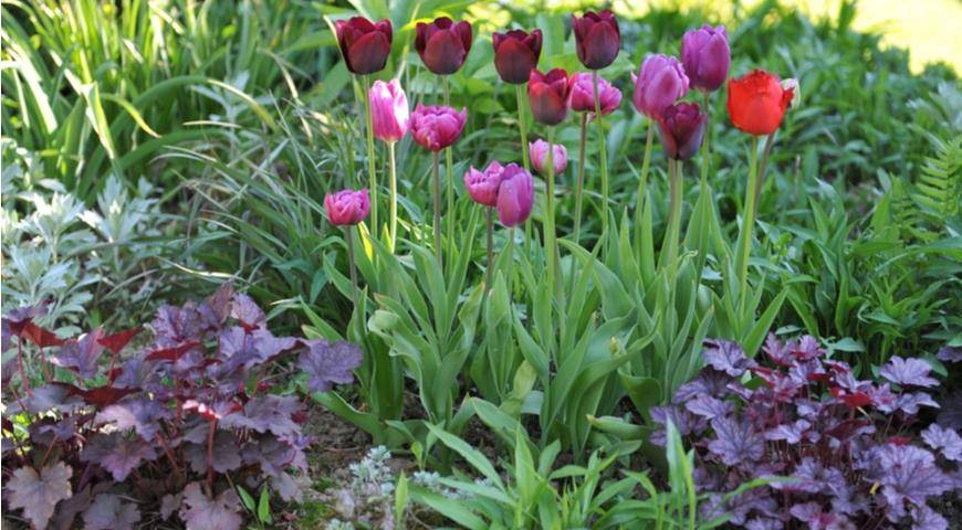 Необычный подход: молочай многоцветный, сиреневые или фуксиевые поздние тюльпаны, гейхера с лимонными листьями, стахис шерстистый, гейхера Sugar Frosting