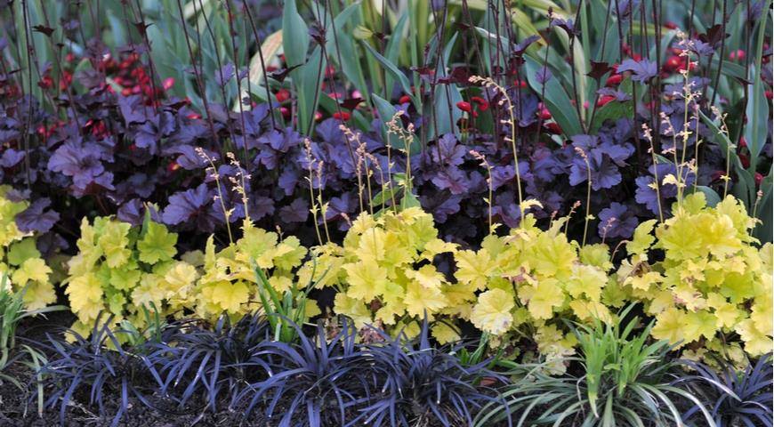 Желтолистная гейхера и офиопогон плоскострелый Нигресценс