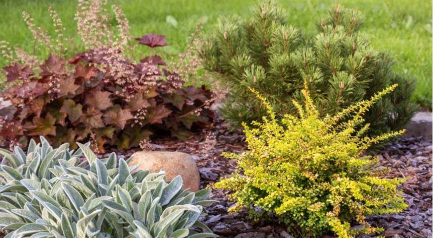 Гейхера, чистец, барбарис, сосна горная