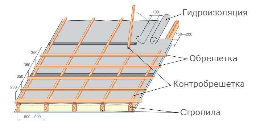 Поверх гидроизоляции монтируют бруски контробрешетки толщиной 40-50 мм. Это обеспечивает необходимый вентиляционный зазор между пленкой и металлочерепицей.