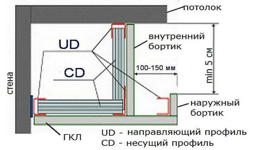 Потребуются пара профилей – UD и CD. UD — направляющий профиль, крепящийся как на стенке и на потолке, а также в точке крепежа бортика, в случае его наличия в центре конструкции. CD — более жесткий, несущий профиль, из которого созданы перемычки и стойки, гипсокартонный лист прикрепляется именно к ним.