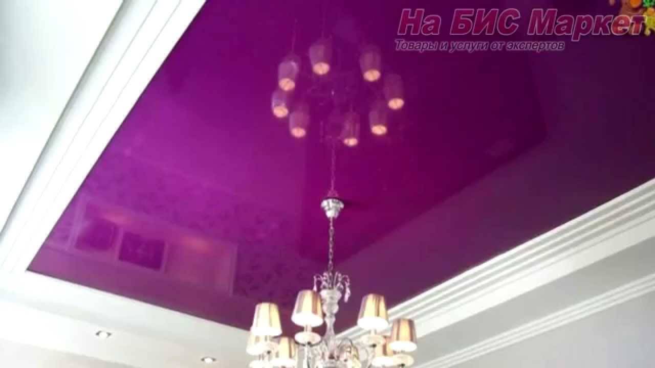 Глянцевый натяжной потолок фиолетового цвета придает комнате стильный м гармоничный вид.