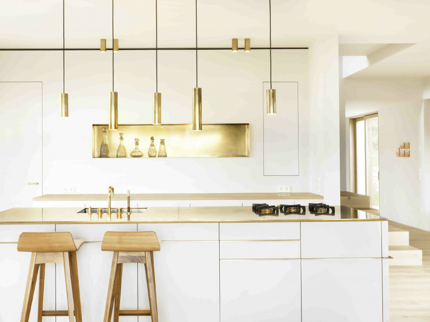Обратить внимание при помощи золота можно и на фартук — особое место на кухне. Самый выигрышный вариант — использовать мозаику. Расписную плитку и фотообои тоже можно использовать