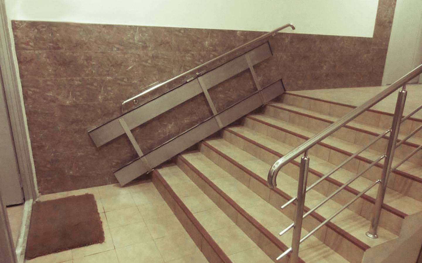 Конечно, это очень простое, но эффективное устройство. Сделать его своими руками будет очень просто. Но есть в этом проекте одна проблема – это неудобство пользования лестничным маршем ходячих людей. Пандус будет занимать приличное место, ведь у него есть свои определенные размеры. К примеру: ширина лестницы в подъезде жилого дома стандартная – 135 см, ширина пандуса для инвалидов должна быть по ГОСТу 90-100 см. По сути, для свободного прохода остается всего лишь 40 см.